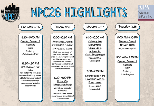 On behalf of the Division’s leadership, welcome! We are so excited to have you on board and cannot wait to get to know and serve you! APA's Women & Planning Division is a great place to make new professional connections and be active in the American Planning Association.