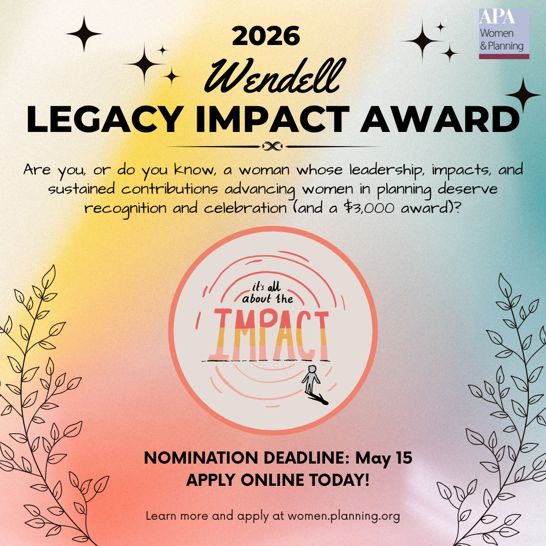 The Wendell Legacy Impact Award is the Women & Planning Division's most prestigious honor. Awarded annually, the Wendell Award recognizes and celebrates Division members building a legacy through their practice, research, and service and exemplifying bold leadership, community impact, and sustained contributions advancing women in planning.